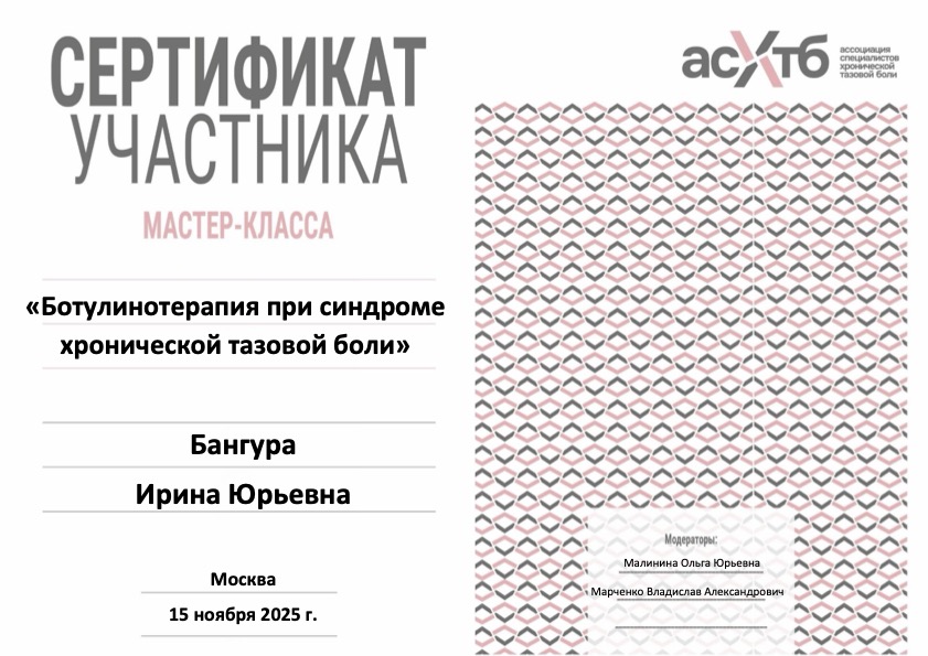 Удостоверение о повышении квалификации по дополнительной профессиональной программе «Эстетическая и реконструктивная урогинекология» (25 ноября 2019 года)