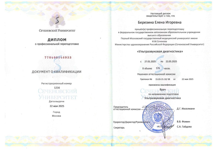 Удостоверение о прохождении клинической ординатуры "Терапия"