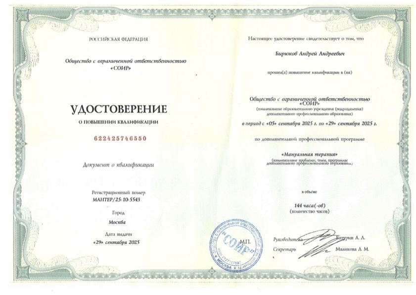 Удостоверение о повышении квалификации "Мануальная терапия"