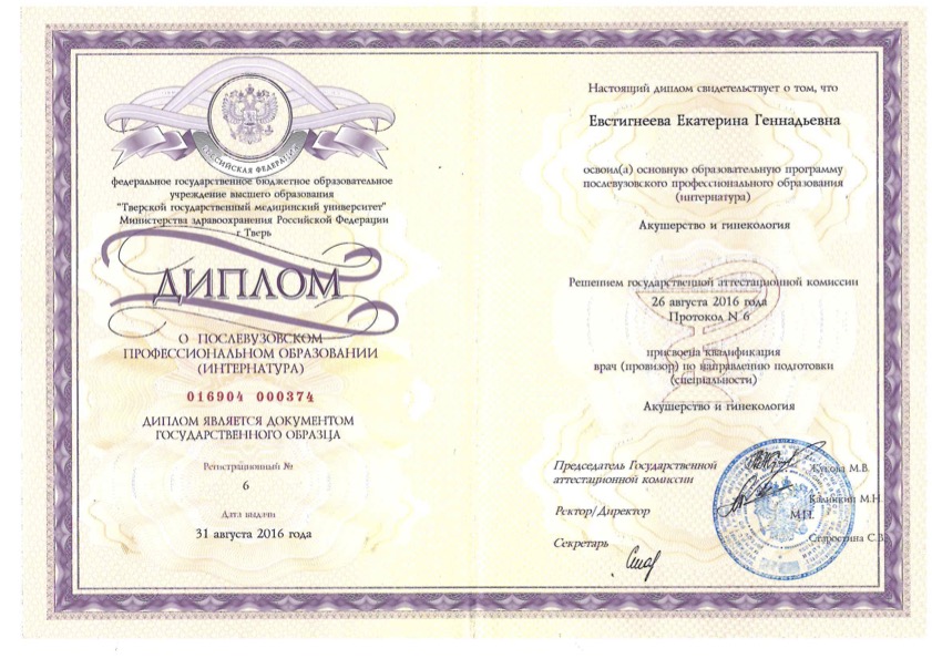 Диплом о послевузовском профессиональном образовании (интернатура) "Акушерство и гинекология"