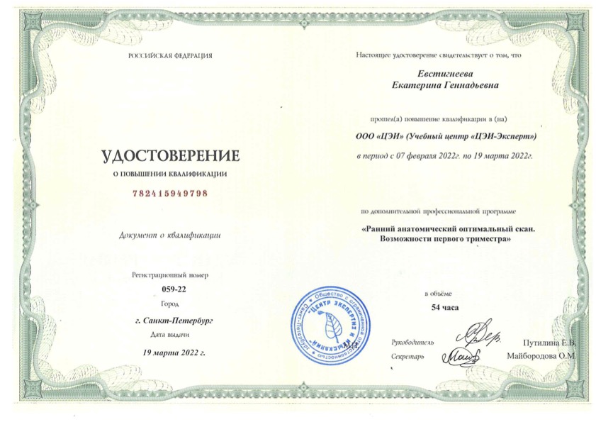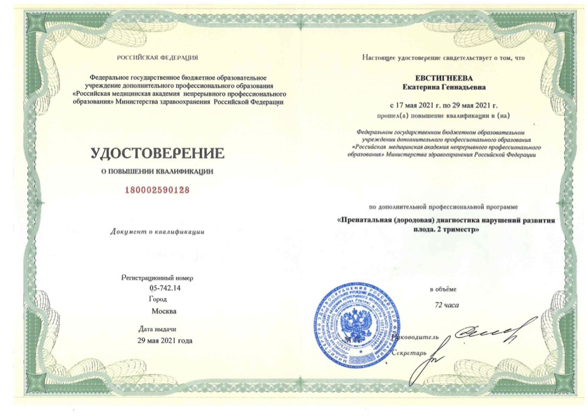 Удостоверение о повышении квалификации «Пренатальная (дородовая) диагностика нарушений развития плода. 2 триместр»