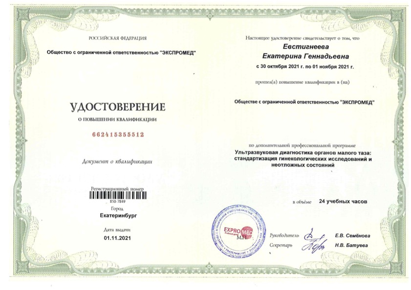 Удостоверение о повышении квалификации "Ультразвуковая диагностика органов малого таза: стандартизация гинекологических исследований и неотложных состояний