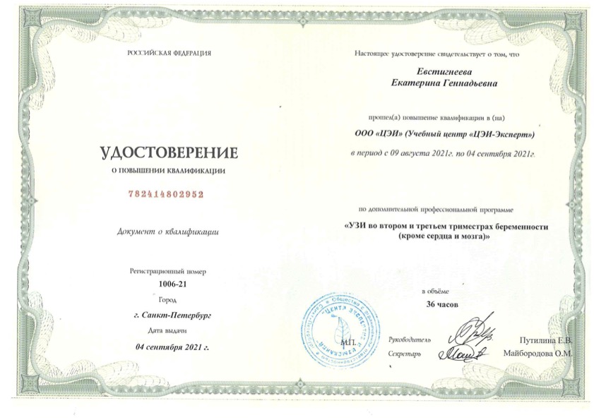 Удостоверение о повышении квалификации « УЗИ во втором и третьем триместрах беременности (кроме сердца и мозга) »