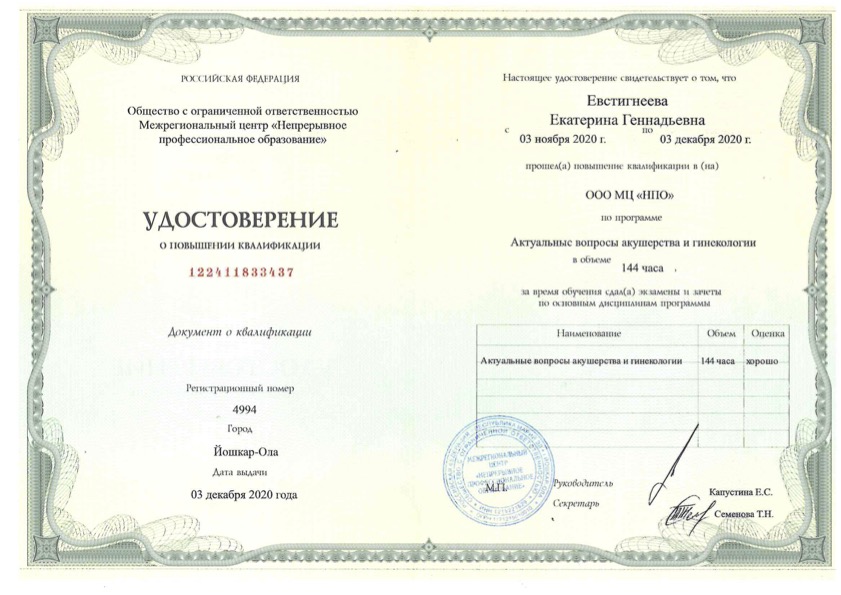 Удостоверение о повышении квалификации по программе "Актуальные вопросы акушерства и гинекологии"