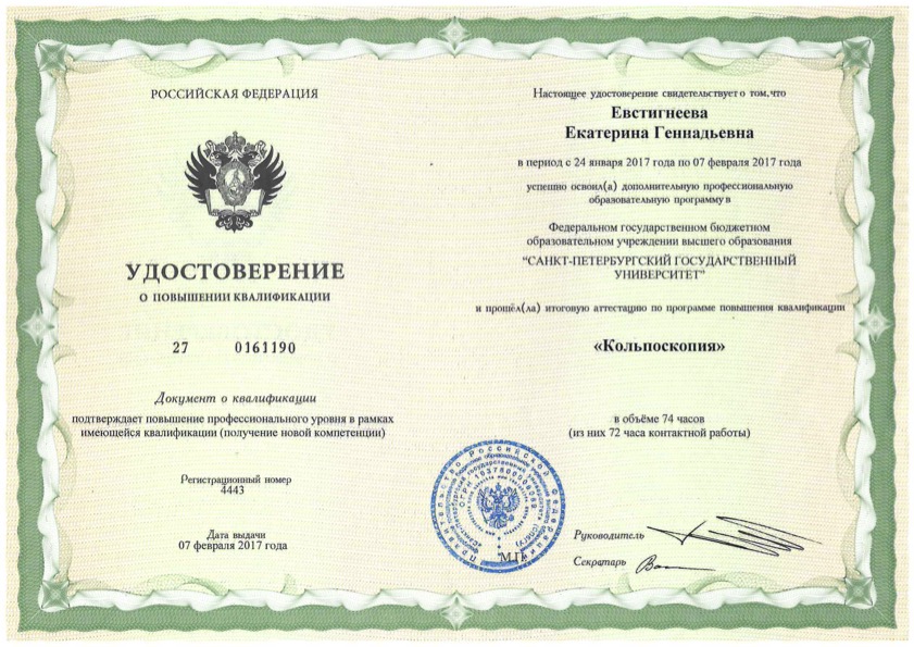 Удостоверение о повышении квалификации "Кольпоскопия"
