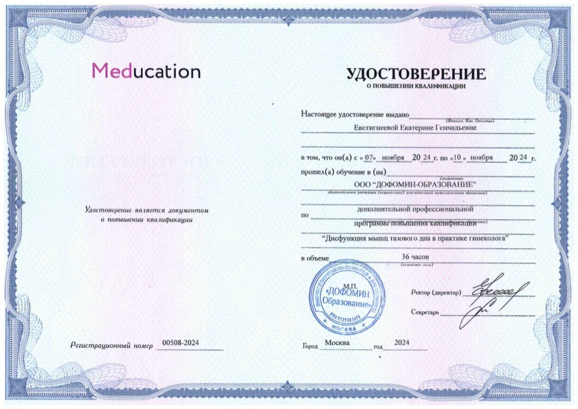 Удостоверение о повышении квалификации "Дисфункция мышц тазового дна в практике гинеколога"