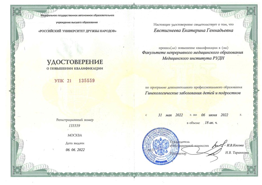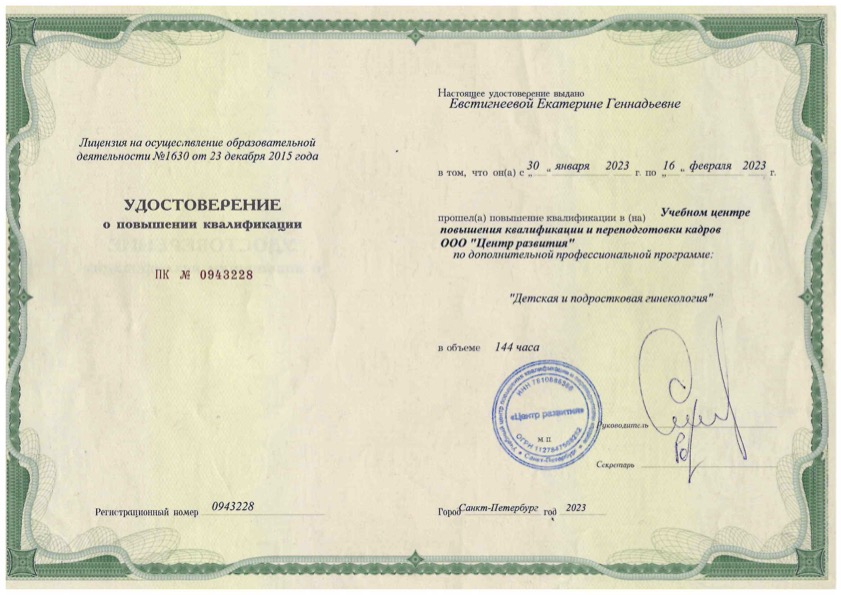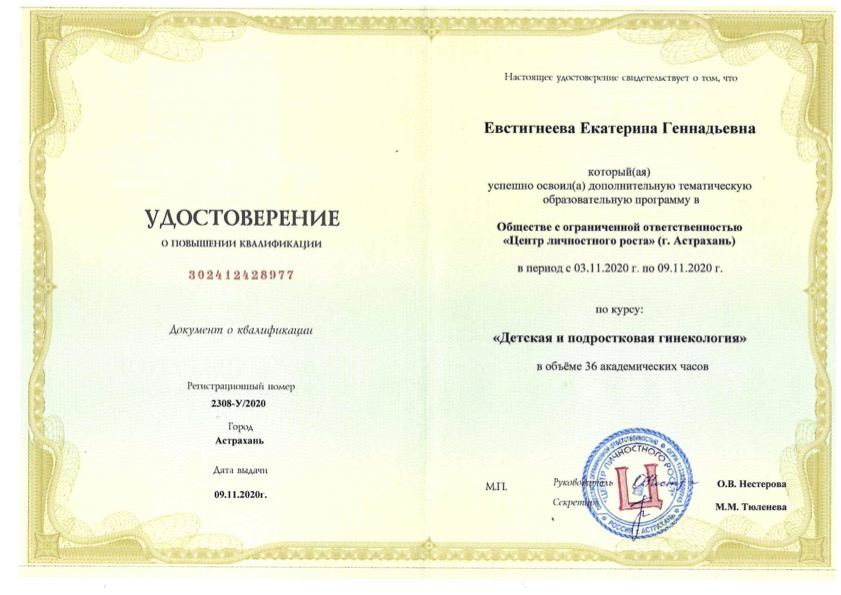 Удостоверение о повышении квалификации "Детская и подростковая гинекология"