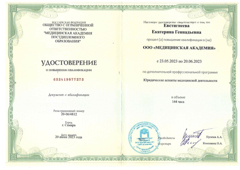 Удостоверение о повышении квалификации "Юридические аспекты медицинской деятельности"