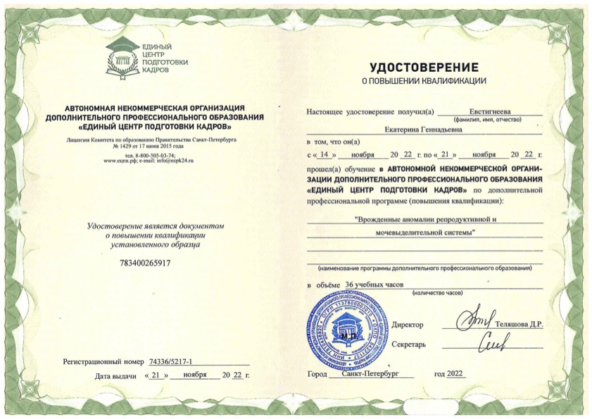 Удостоверение о повышении квалификации "Врожденные аномалии репродуктивной и мочевыделительной системы"