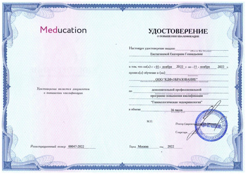 Удостоверение о повышении квалификации "Гинекологическая эндокринология"