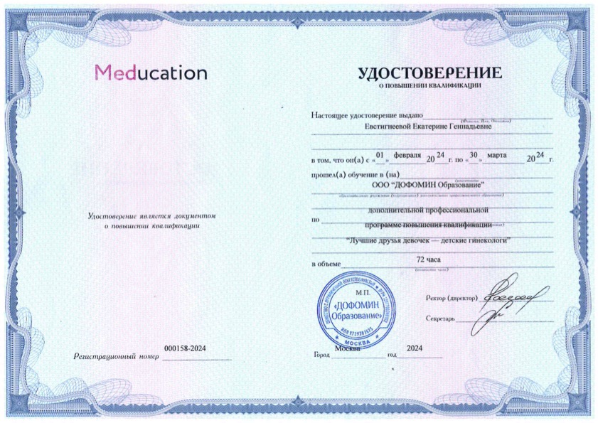 Удостоверение о повышении квалификации "Лучшие друзья девочек-детские гинекологи"