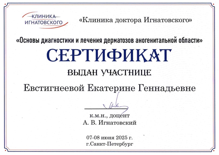Сертификат "Основы диагностики и лечения дерматитов аногенитальной области"