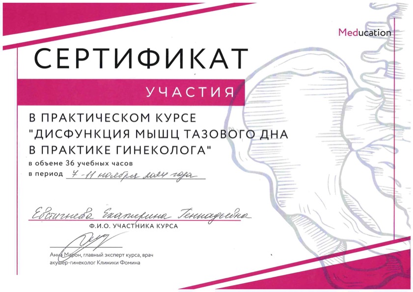 Сертификат участия в практическом курсе "Дисфункция мышц тазового дна в практике гинеколога"