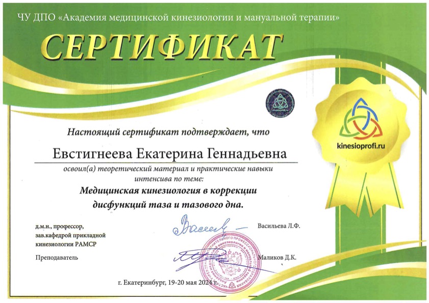 Сертификат "Медицинская кинезиология в коррекции дисфункции таза и тазового дна"