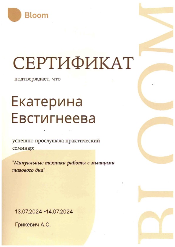 Сертификат "Мануальные техники работы с мышцами тазового дна"