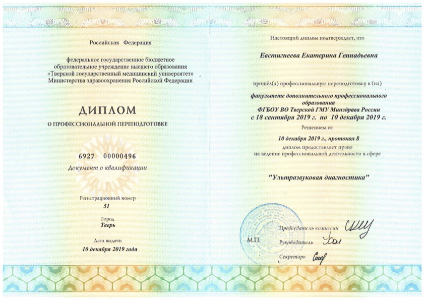 Диплом о профессиональной переподготовке "Ультразвуковая диагностика"