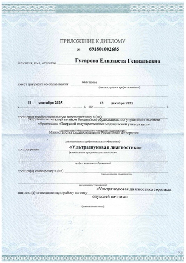 Диплом о прохождении ординатуры "Акушерство и гинекология"