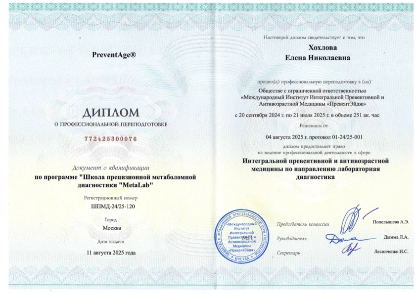 Диплом о предоставлении права на ведение профессиональной деятельности в сфере Интегральной превентивной и антивозрастной медицины по направлению лабораторная диагностика