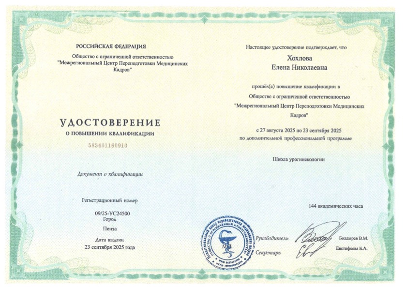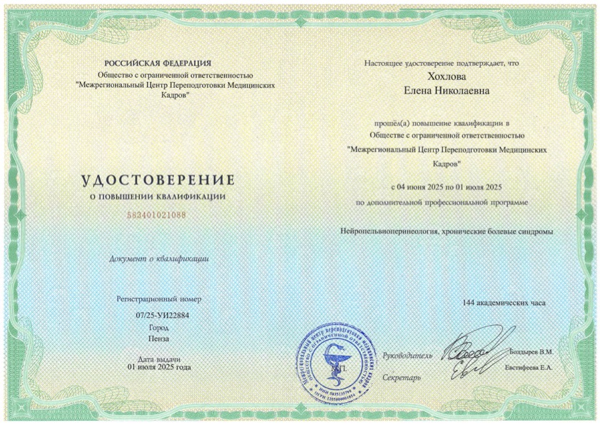 Удостоверение о повышении квалификации по дополнительной профессиональной программе Нейропельвиоперинеология, хронические болевые синдромы