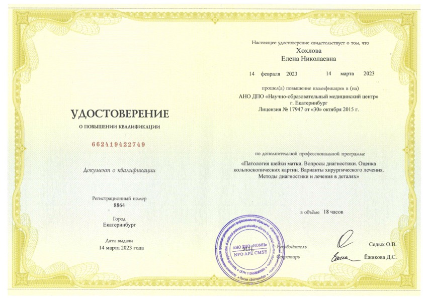Удостоверение о повышении квалификации «Патология шейки матки. Вопросы диагностики. Оценка кольпоскопических картин. Варианты хирургического лечения. Методы диагностики и лечения в деталях»